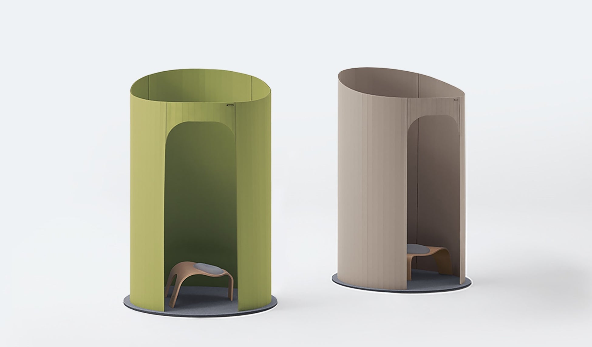 「マインドフルネスブース」は、柔らかい洗練されたデザインと、簡単に組み立てることができコンパクトに収納できる機能性を兼ね備えた、オフィス内でも瞑想に集中できる簡易ブースです。パネル本体とベースは面ファスナーで連結しているため簡単に取り外しができ、未使用時は丸めて片付けることも可能です。マインドフルネススツールと一緒に使用することで、瞑想や祈りの空間、休憩スペースとして利用することができます。オフィスで瞑想がしやすい空間を容易に作り、働く人の心の健康をサポートします。