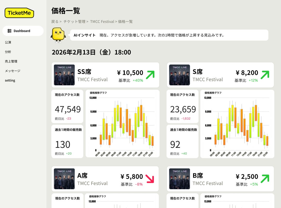 株式会社チケミー(所在地:東京都港区、代表:宮下大佑)は、ライブ・イベント向けのチケット販売において、需要に応じて価格が変動する「ダイナミックプライシング機能」の開発を進めており、一部の顧客に対して先行テストを開始しました。