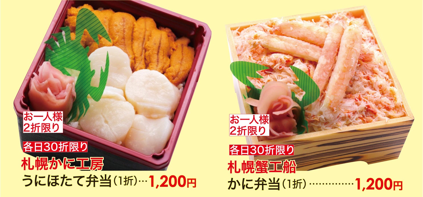 連日大盛況の「北海道大物産展」で大好評のグルメが再登場。海鮮弁当をはじめ、旬の食材「蟹」で年末年始を豪華に。初登場の「ふらの赤肉メロンパン」、「札幌カタラーナスペシャルいちご」、「バスクチーズケーキ」などスイーツが充実!〈ロイズ〉〈六花亭〉〈札幌農学校〉など北海道の大人気スイーツも目白押し!