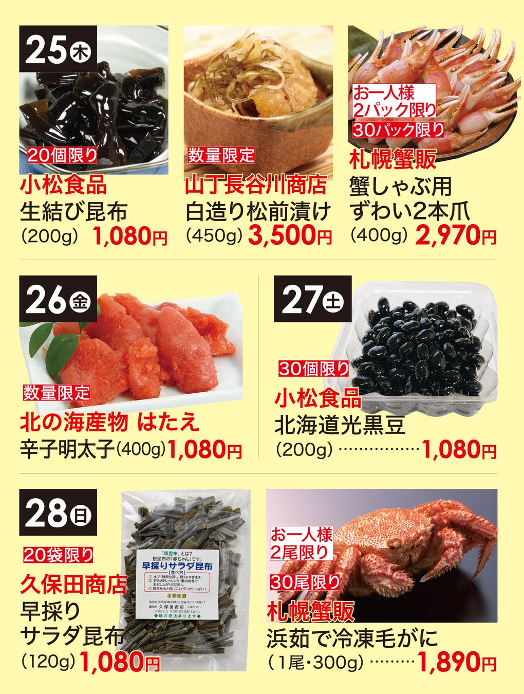 実演販売19店舗と出品5店舗の総勢24店舗が出店する、特別な6日間。2025年の締めくくりに家族団欒の食卓で、今年一年頑張ったご自身への労いやご褒美に、そしてお正月のめでたい食卓にぜひ北海道グルメをご堪能ください。