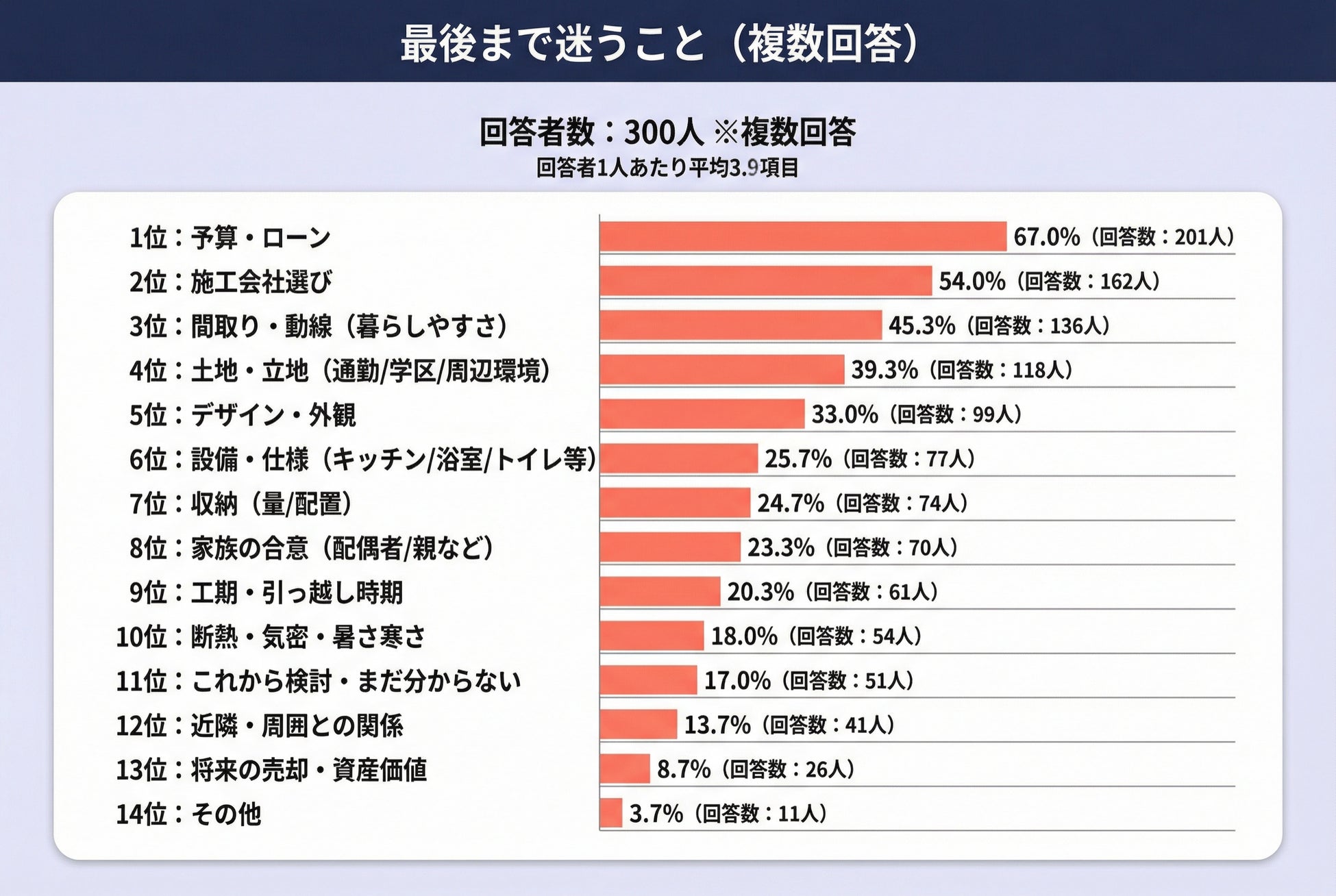 【結果1】家づくりで最後まで迷うこと最多は予算67.0%(201人)。1人あたり平均3.9項目を選択