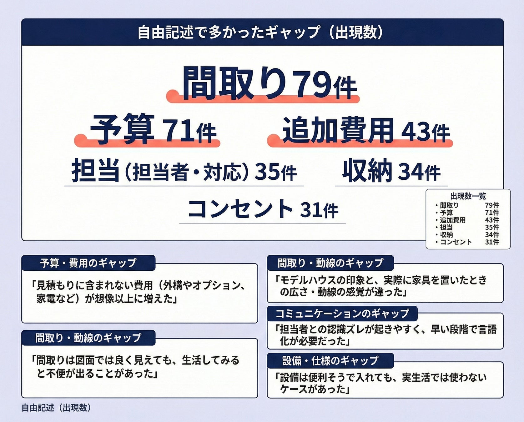 ・自由記述では間取り79件、予算71件、追加費用43件が多く、想像と現実のズレの中心に