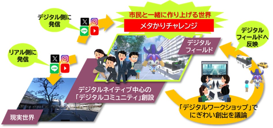 そこで当社の持つ仮想空間(メタバース)プラットフォーム技術を活用し、仮想空間内での「にぎわい」創出を議論する「デジタルワークショップ」を開催します。この仮想空間での「にぎわい」創出を現実世界へフィードバックすることで刈谷市のまちづくりの活性化をめざします。