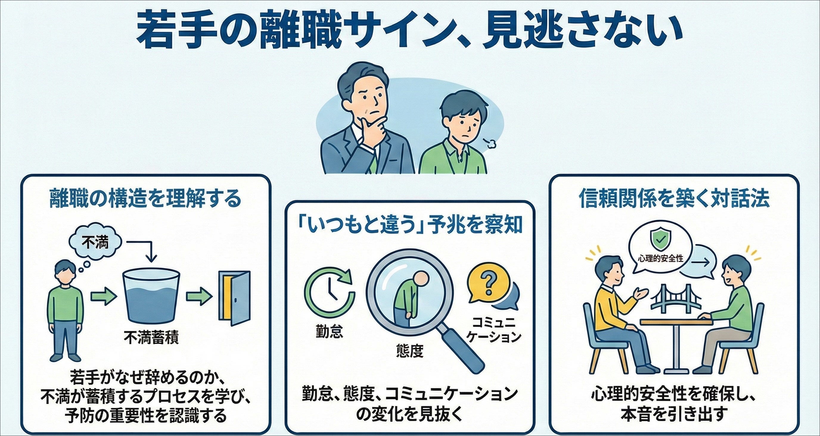 手遅れになる前にこれらの予兆を捉え、適切な支援を行うスキルが管理職には求められています。離職が起こる構造を正しく理解し、予防的な関わりを行うことで、若手社員の離職を防ぎ、定着を促すニーズが高まっています。