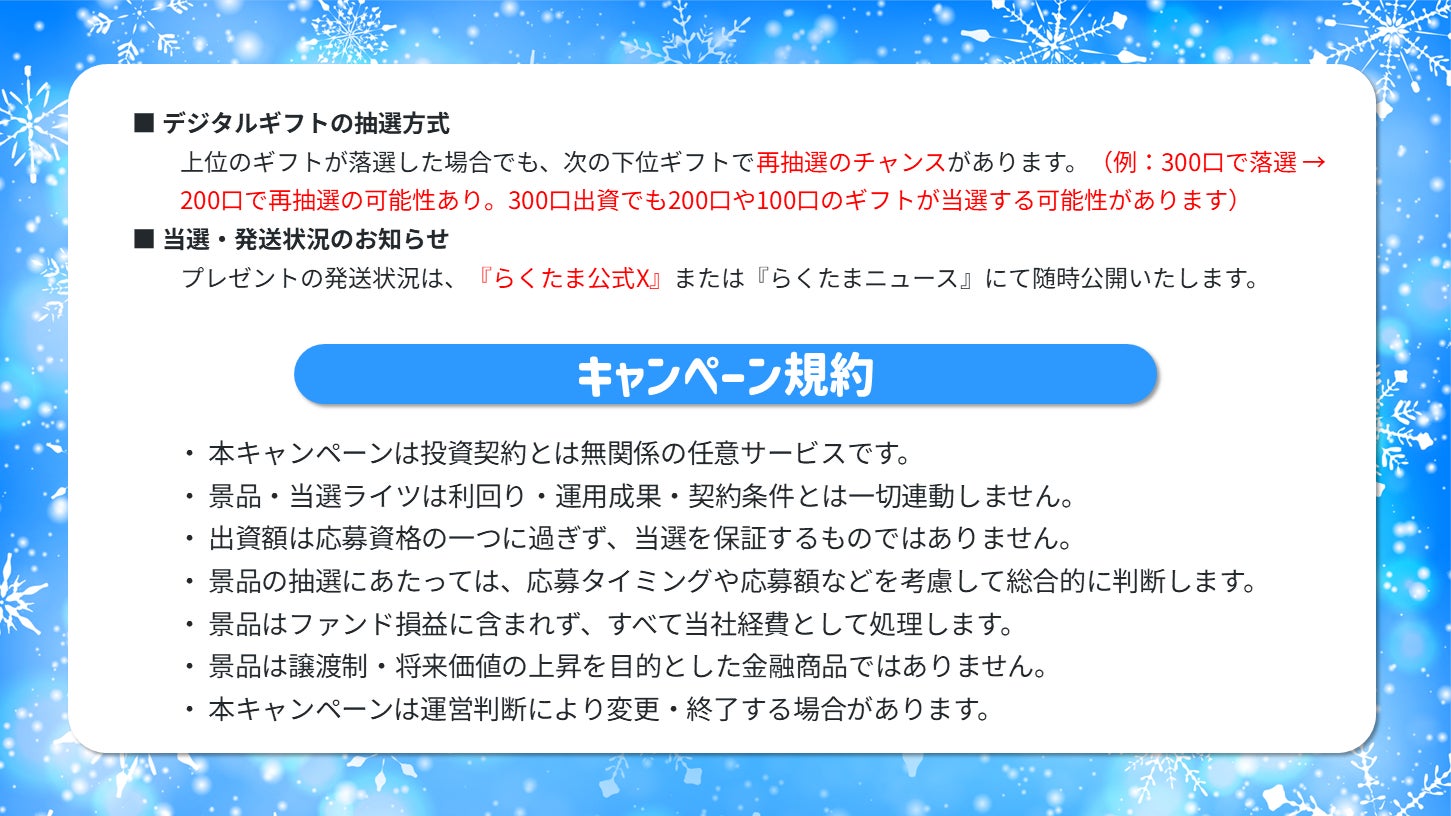 『らくたま』は、不動産クラウドファンディングをより安心で身近な資産形成の手段としてお届けするために誕生しました。私たちは安全性と透明性を常に重視し、堅実なファンド設計と多彩な特典プログラムを通じて、従来の「投資=堅い・難しい」という固定観念を取り払い、誰もが1万円から参加できる新しい投資体験を提供してまいります。