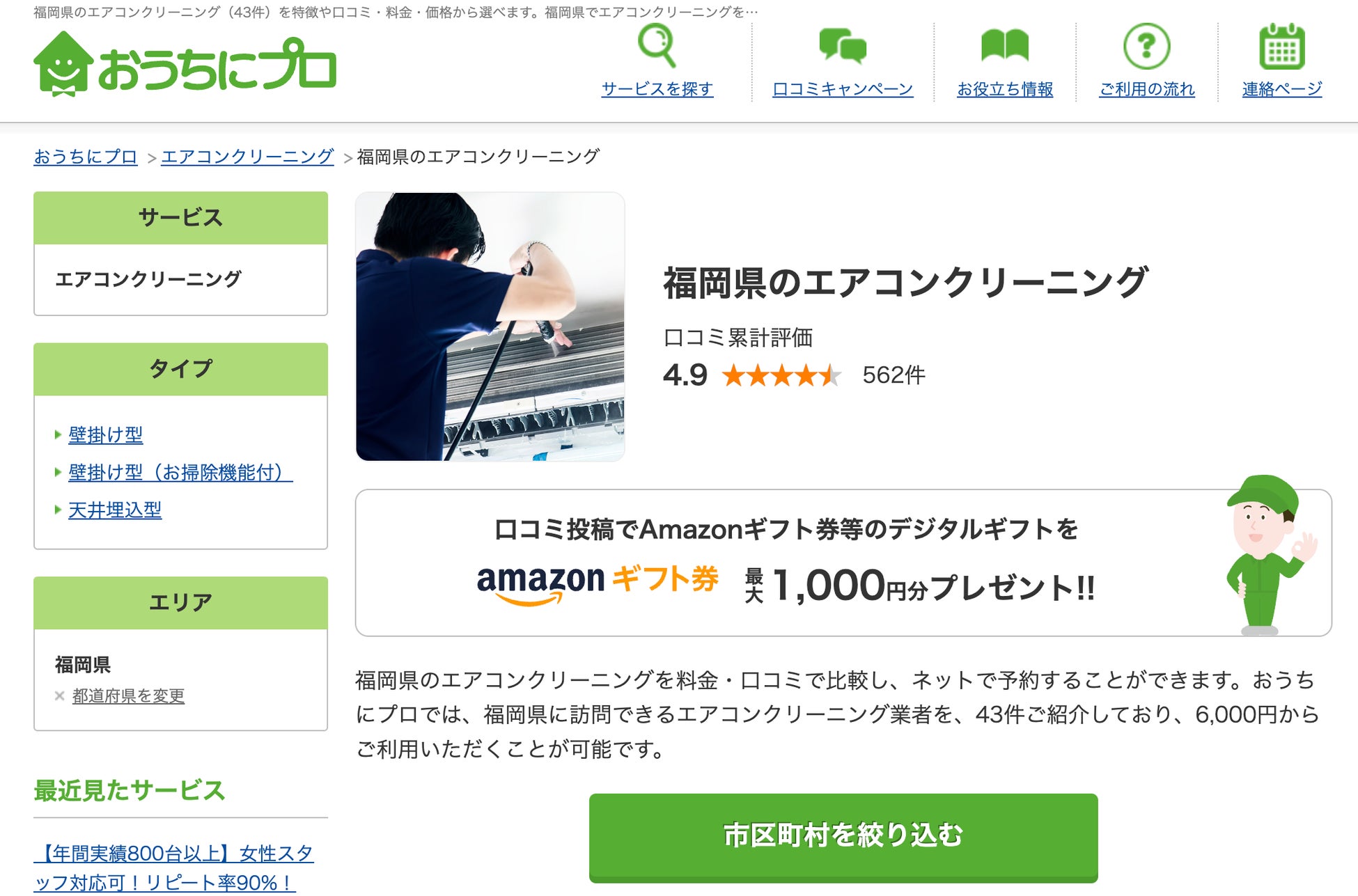 おうちにプロとは、エアコンクリーニングをはじめとするハウスクリーニング(お風呂、換気扇など)や家事代行などといった多種多様な出張訪問サービスを検索・予約できるサイトです。