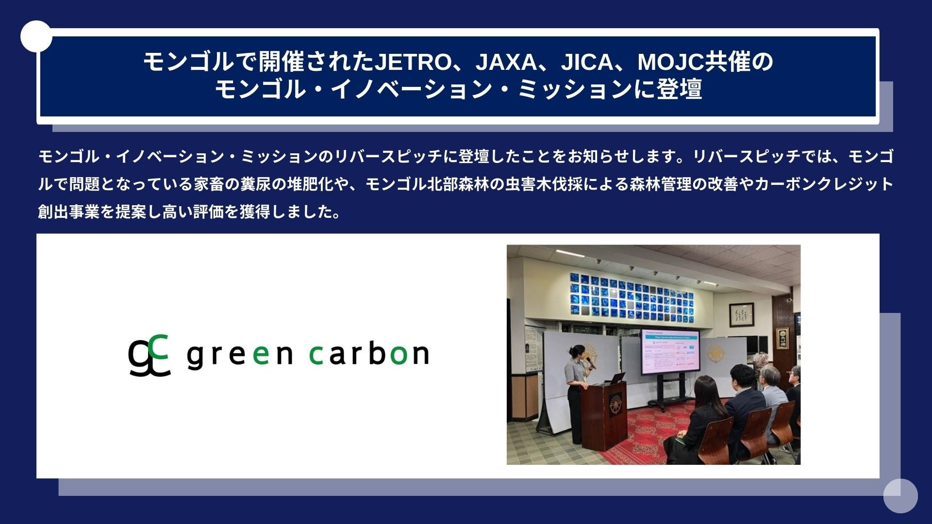 Green Carbon株式会社(代表取締役:大北潤、以下Green Carbon(読み;グリーンカーボン))はモンゴル首都のウランバートルで開催された、日本貿易振興機構(以下、JETRO)、宇宙航空研究開発機構(以下、JAXA)、国際協力機構(以下、JICA)、モンゴル日本人材開発センター(以下、MOJC)共催、モンゴル・イノベーション・ミッションのリバースピッチに登壇したことをお知らせします。リバースピッチでは、モンゴルで問題となっている家畜の糞尿の堆肥化や、モンゴル北部森林の虫害木伐採による森林管理の改善やカーボンクレジット創出事業を提案し高い評価を獲得しました。