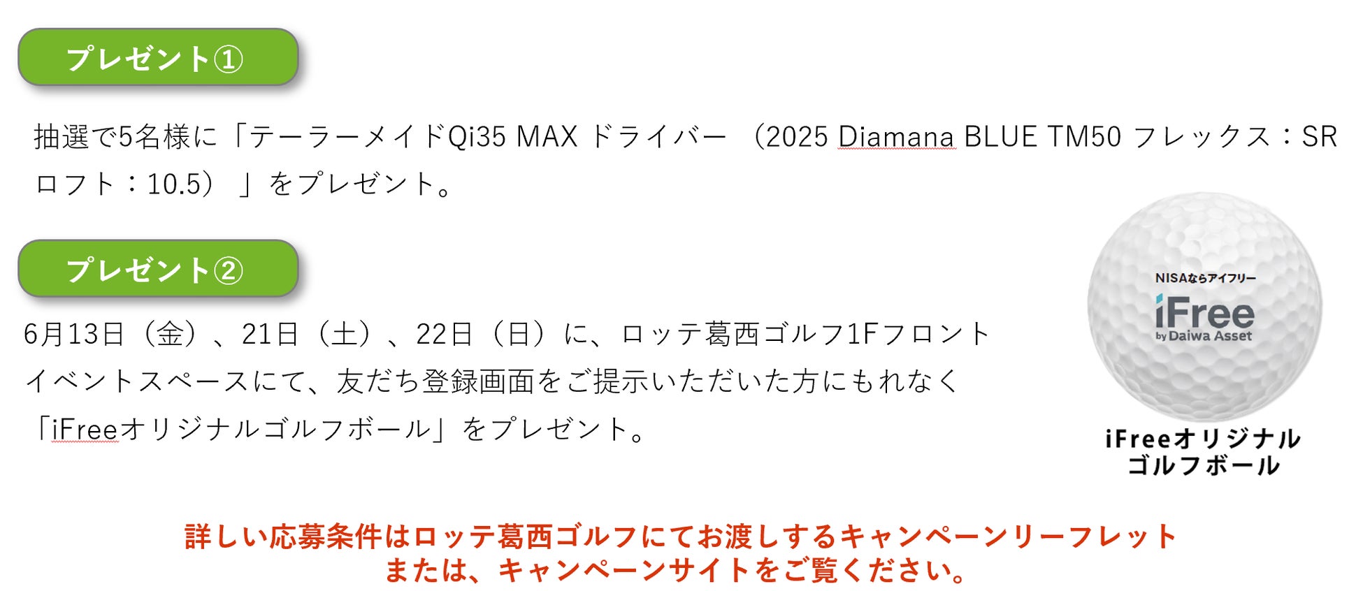 期間中に大和アセットマネジメントのファンドシリーズiFreeのLINE公式アカウントを友だち登録し、アンケートにご回答いただいた方の中から、抽選で5名様に「テーラーメイドQi35 MAX ドライバー」をプレゼントいたします。さらに、6月13日(金)、21日(土)、22日(日)の3日間に、ロッテ葛西ゴルフ1Fフロントイベントスペースにて、友だち登録画面をご提示いただいた方には、もれなく「iFreeオリジナルゴルフボール」をプレゼントいたします。