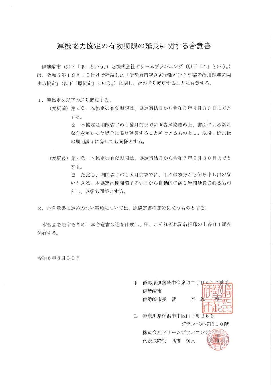 (株)ドリームプランニング×伊勢崎市空き家バンクの情報事業の活用推進に関する協定の有効期限延長の合意のお知らせ