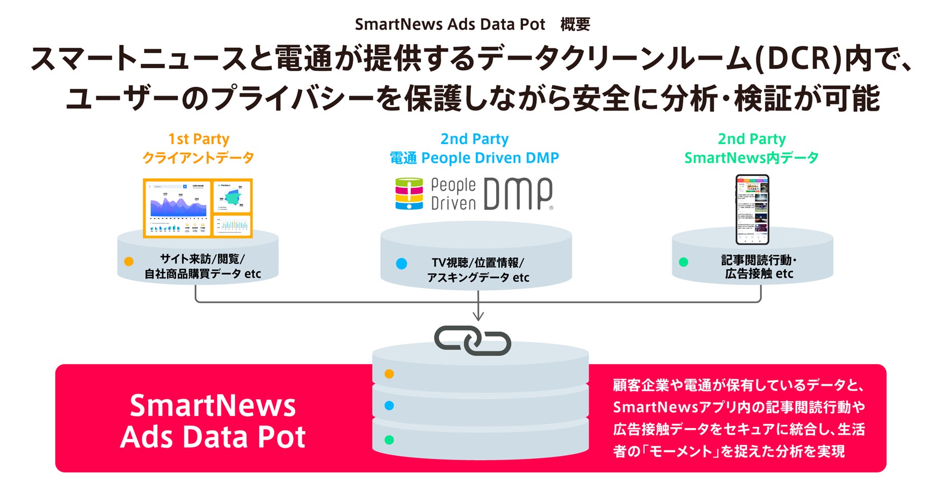 株式会社電通デジタル(本社:東京都港区 代表取締役社長執行役員:瀧本 恒 以下、電通デジタル)と株式会社電通(本社:東京都港区 代表取締役 社長執行役員:佐野 傑 以下、電通)は、スマートニュース株式会社(本社:東京都渋谷区 代表取締役社長CEO:浜本 階生 以下、スマートニュース)と共同で、ユーザーのプライバシーを保護しながら安全にデータ分析ができるデータクリーンルーム「SmartNews Ads Data Pot」を構築しました。スマートニュースが運営するニュースアプリ「SmartNews」の記事閲読行動データなどを活用し、生活者の「モーメント」を捉えたマーケティング支援を本日より開始します。