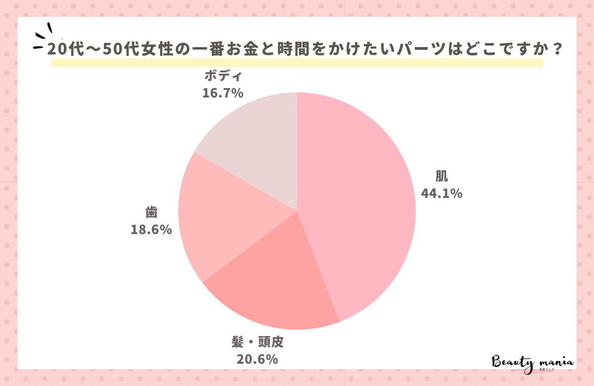 「一番お金と時間をかけたいパーツはどこですか?」とアンケート調査した結果、1位は『肌(45人)』、2位は『髪・頭皮(21人)』、3位は『歯(19人)』となりました