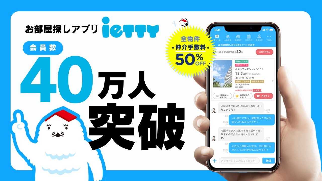 オンラインAI賃貸仲介サービスの「ietty」が、会員登録者数40万人を突破