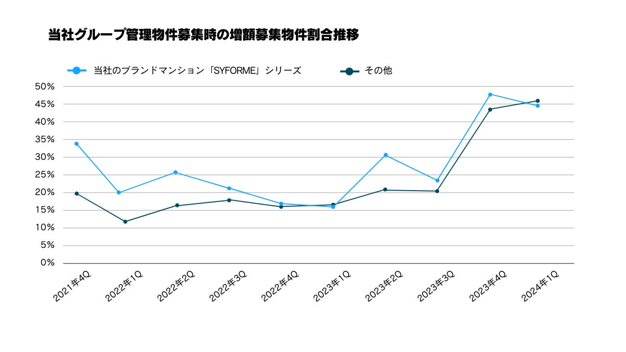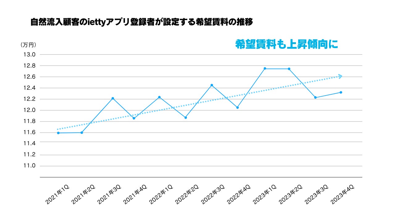 東京23区においては、コロナ収束以後徐々に賃料が上昇傾向にあります。特に2023年以降は大幅に上昇しており、2024年度以降も上昇傾向は続く見込みです。iettyを通じて取得したデータによると、シーラテクノロジーズグループの管理物件においても、増額募集する物件の割合・平均募集賃料ともに同様のトレンドであり、2023年以降に急上昇しています。iettyおよびシーラテクノロジーズグループの賃貸仲介事業領域においても同様の傾向が見られ、顧客が設定する希望賃料も2023年を境に上昇しています。