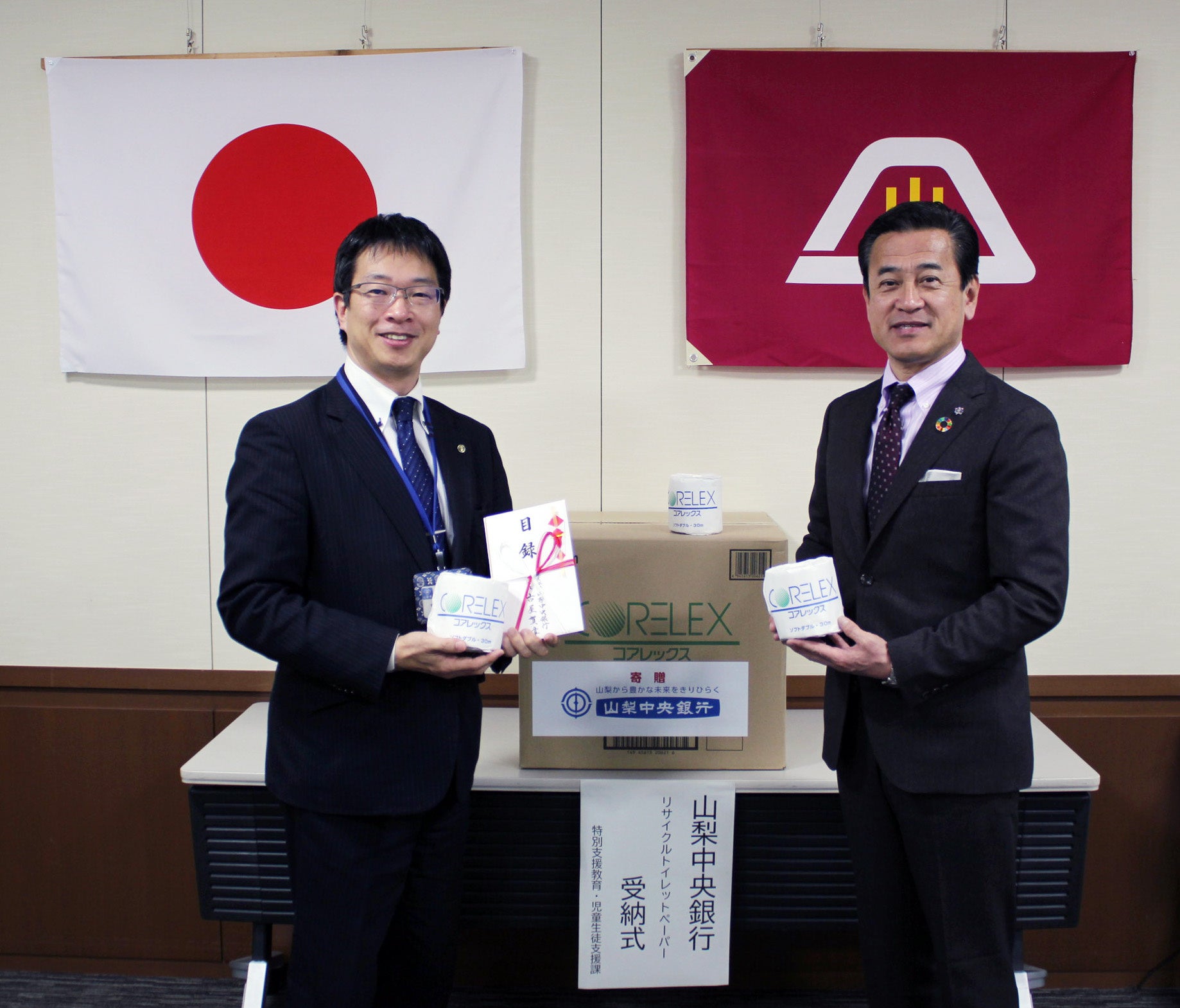 株式会社山梨中央銀行(頭取 古屋 賀章)は3月1日(金)、地域社会貢献への取組みの一環として、山梨県内の特別支援学校14校の皆さまへ、当行内で使用された紙文書を再生利用したリサイクルトイレットペーパー(5,000ロール)を贈呈いたしました。