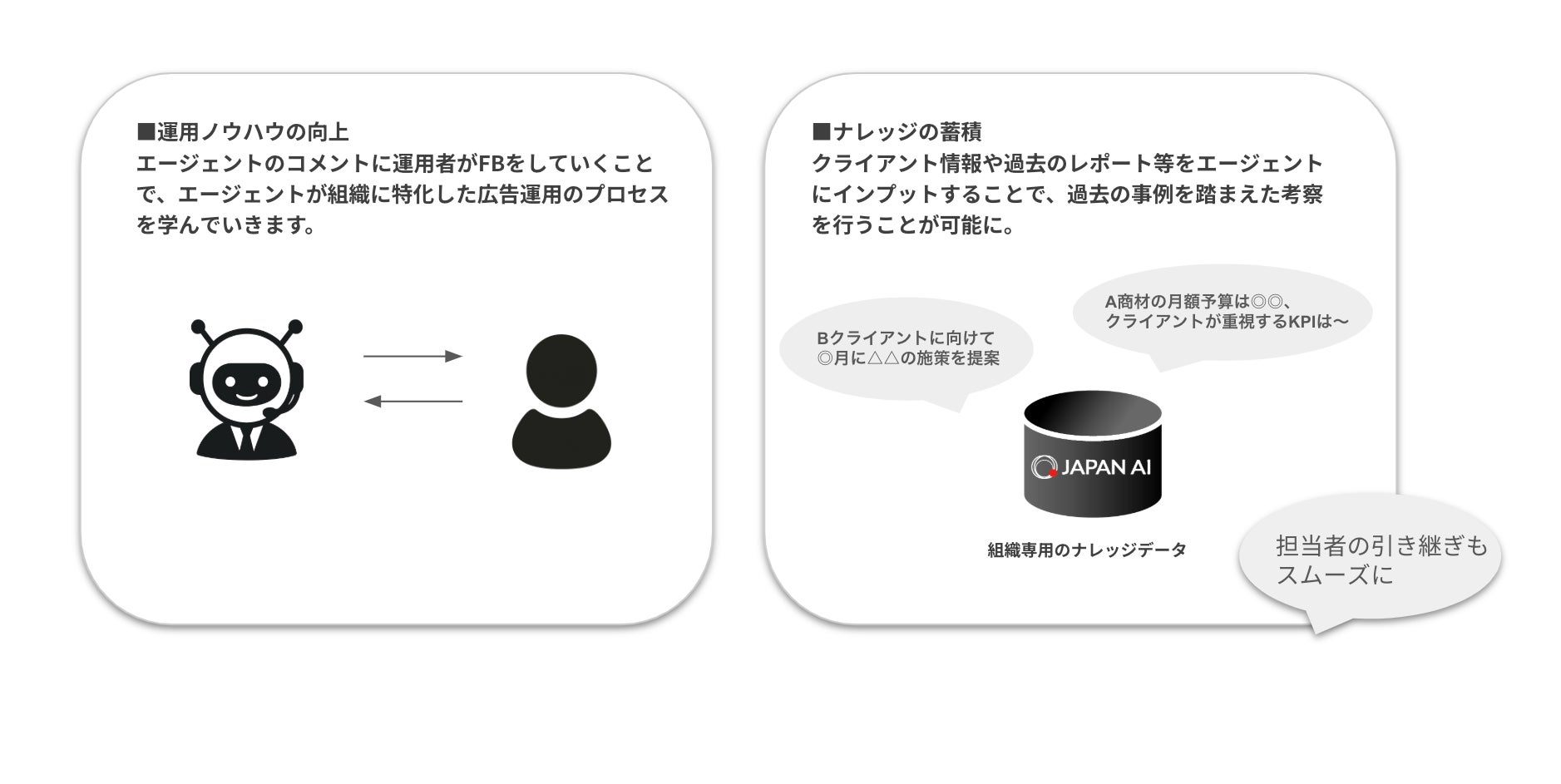 また、直近では、組織ナレッジを蓄積・反映させることで、各組織固有の知見を活用した分析・改善提案ができるエージェントへの進化を目指しています。経験値の高い広告運用者からのフィードバックや商材情報を継続的にインプットすることで、より実務に即した精度の高い改善提案を実現してまいります。