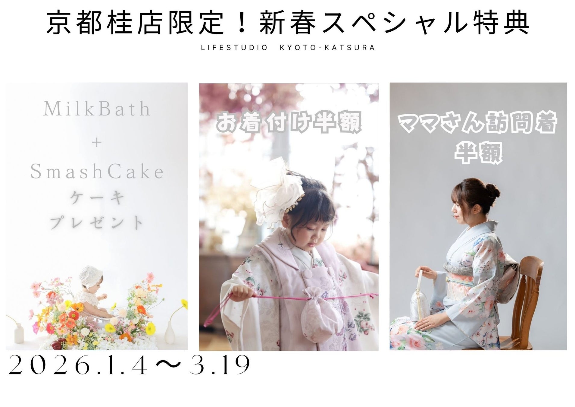 京都市・西京区のライフスタジオ京都桂店では、2026年1月4日〜3月19日の期間限定で、「ミルクバス撮影」「七五三後撮り」「ママの訪問着お支度」を対象にした豪華3大特典を実施いたします。