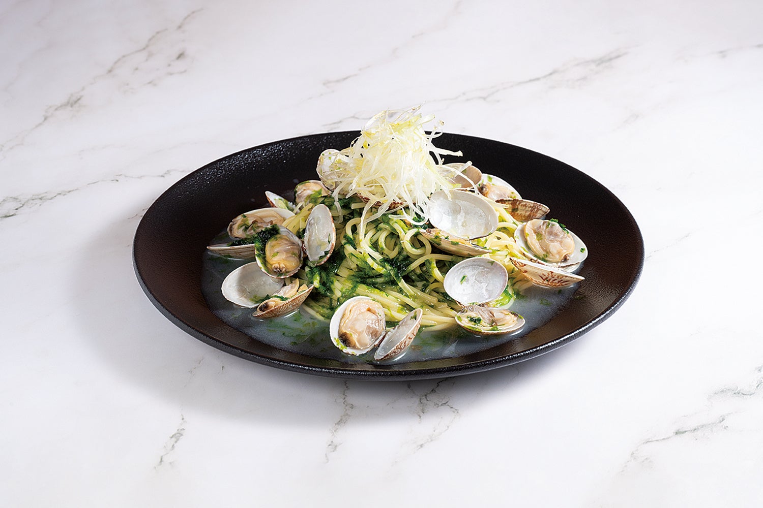 磯の香りがふわりと広がる生のりと旨味たっぷりのあさりを、おだしの味わいが光る上品な和風パスタでお楽しみください。