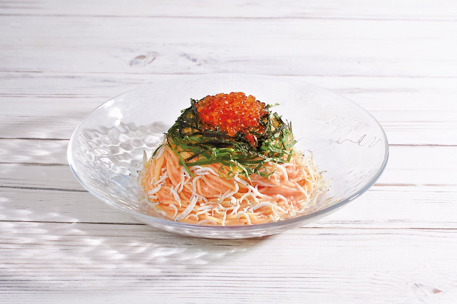 人気の明太子パスタにいくらと釜揚げしらすをトッピングした海の幸たっぷりの贅沢パスタ。ぴりっと辛い明太子と大葉の豊かな風味が爽やかに広がります。