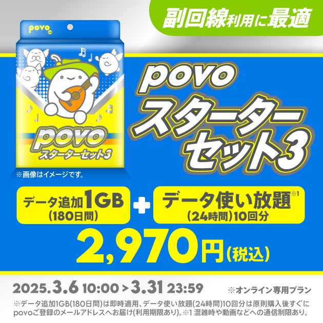 KDDI、沖縄セルラーは2025年3月6日から3月31日まで、povo2.0の期間限定トッピングとして、「povoスターターセット」全3種を提供します。