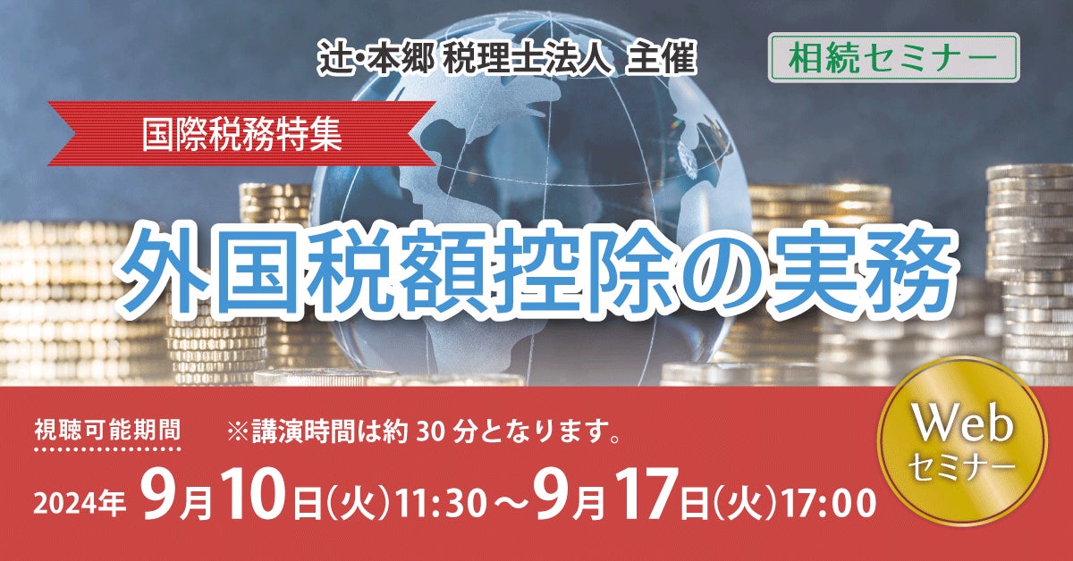 辻・本郷 税理士法人(本社:東京都新宿区、理事長:徳田孝司)は、2024年9月10日(火)より「【相続セミナー】国際税務特集 外国税額控除の実務」を開催いたします。本セミナーでは、国外所得に対する二重課税の調整のための制度である外国税額控除に焦点を当てて、重要な論点となる事例について説明します。米国やシンガポールといった日本と関係が深い諸外国の租税条約や申告スケジュールなど、実務事例を交えながら計算方法を分かりやすく解説します。