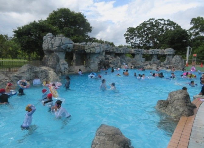百目木公園プールには、大自然をイメージした修景プールや、スピード感あふれる全長50mの大型スライダーがあり、子供から大人まで楽しめる施設です。