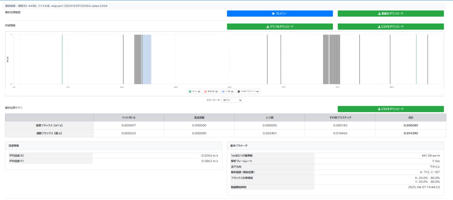 本システムはWEBサービス形式で提供されます。ユーザーは、対象となる河川の動画を撮影し、システム上にアップロードすることで、動画内に映るごみの輸送量を自動で算定することができます。これにより、特定の河川におけるごみ輸送量の傾向を把握することが可能となります。