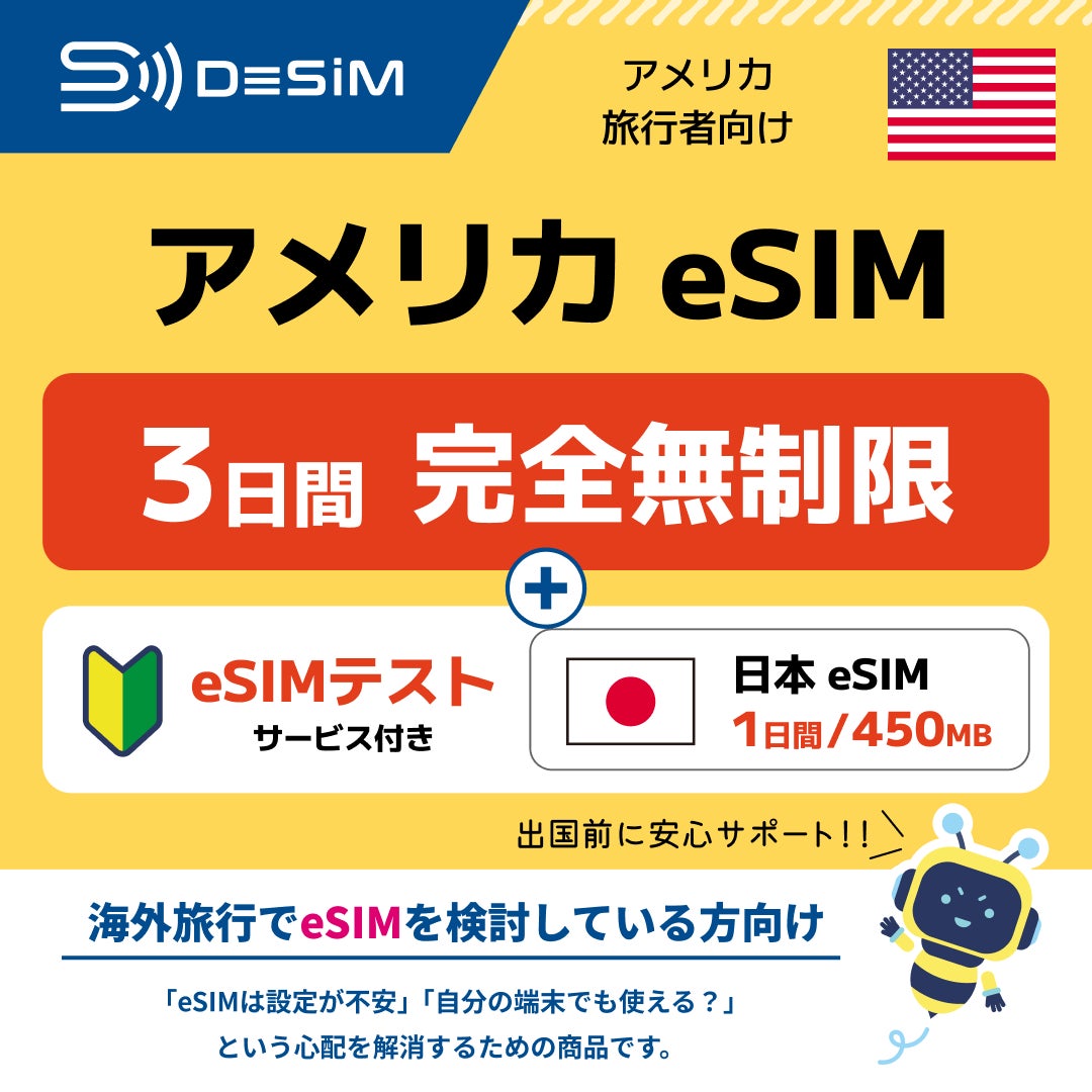 速報JAPAN株式会社(本社: 神戸市、代表: 賀詞)が運営するブランド「DeSiM」は、アメリカ渡航者でeSIMを初めて利用するユーザに向けて、「eSIMテストサービス付きアメリカeSIM3日間無制限プラン」を新たに発売しました。アメリカ旅行前に「eSIMを使ってみたいけど設定が不安」「自分の端末で使えるか心配」といった悩みを解消できる、まさにアメリカ旅行者に最適なセットプランです。