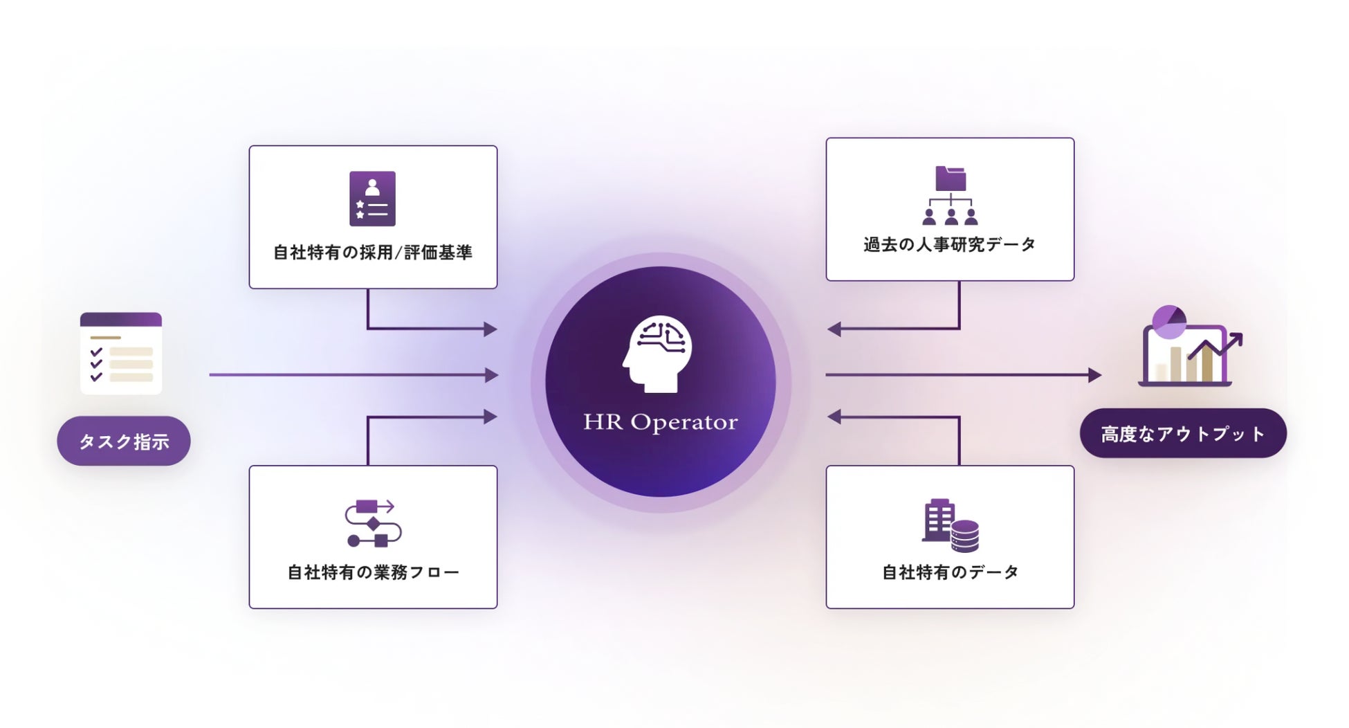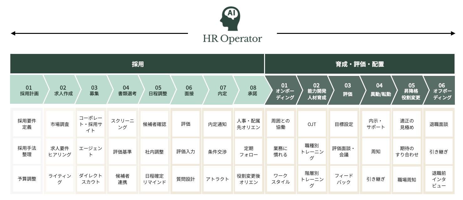 「HR Operator」は、採用、マネジメント・評価など、全ての人事業務を貴社業務・基準を学習・カスタマイズしAIエージェントで自動化を行うサービスです。