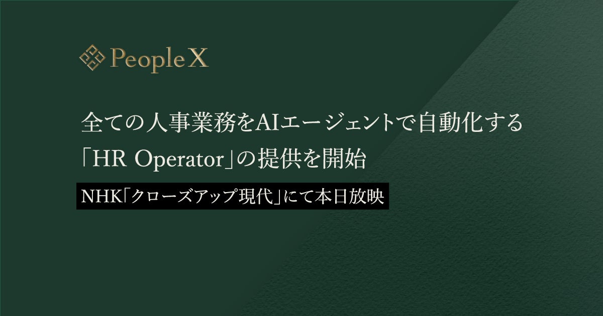 採用から活躍支援まで、AIで人事課題を解決する株式会社PeopleX(本社:東京都新宿区、代表取締役CEO:橘 大地)は、企業ごとの固有の人事要件と業務プロセスを分析し、AIエージェントによる最適なシステムを構築するサービス「HR Operator(エイチアール・オペレーター)」の提供を開始したことをお知らせいたします。本サービスは、採用領域から、入社後の活躍支援であるマネジメント・評価領域まで、幅広く対応いたします。また、本サービスがNHK「クローズアップ現代」の5月7日(水)19時半からの放映にて取り上げられる予定です。