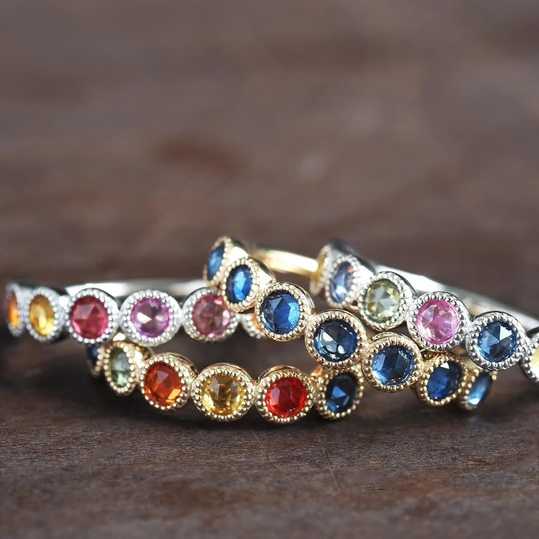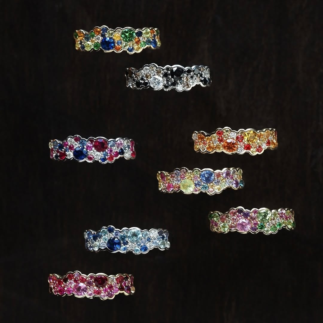 パーセル ジュエリーを象徴するシグネチャーモデルです。宝石のブーケを思わせる優雅なデザインで、中世の貴婦人たちを魅了したクラシカルなスタイルを再現しています。槌目をつけたアームや中石を取り巻くデザインが、古き良き時代のエッセンスを色濃く感じさせます。また、カラーパヴェをダイヤモンドで囲んだ『ポンポネモザイク』をはじめ、豊富なバリエーションが揃っています。8mm、6mm、4mmのリングを重ね着けするスタイルもおすすめです。