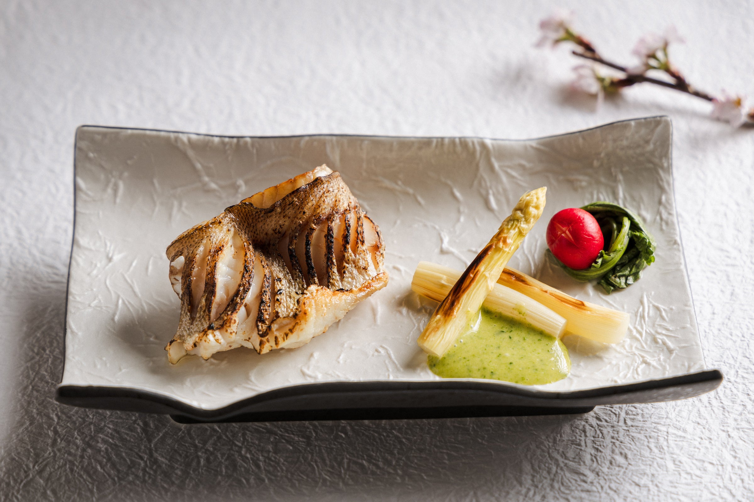 脂の乗ったメバルをシンプルに塩焼きにしました。春らしく蓼と玉子を合わせたさわやかな風味のソースはホワイトアスパラガスにつけてお召し上がりください。