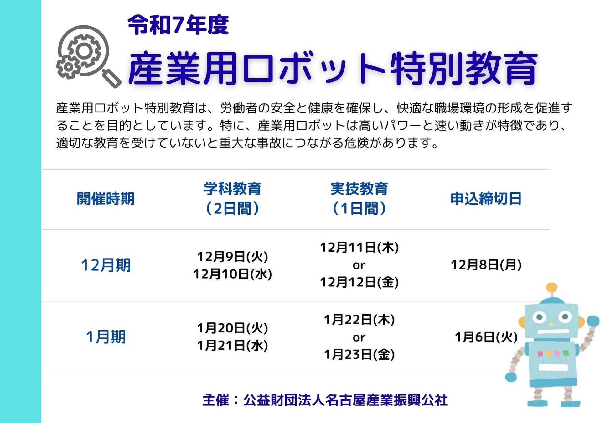 「令和7年度 産業用ロボット特別教育12月期・1月期」のご案内 労働安全衛生法第59条および労働安全衛生規則第36条に義務付けられた安全教育です。12月期、1月期の受講者を募集します。
