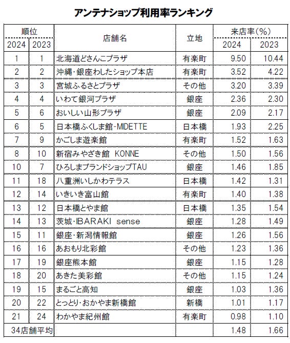 年間での来店率が最も高かったのは北海道どさんこプラザで9.50%。同店は2017年の調査から連続1位となっている。しかし、同店が安泰とは言えない。前回調査の10.44%よりおよそ1ポイントも低下しており、これは34店中で最も下げ幅が大きいからだ。