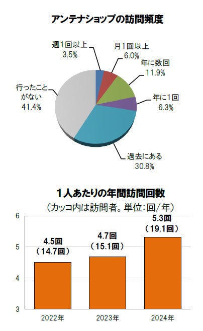 東京にあるアンテナショップに、1年間に1店以上に来店・利用したことがある人(以下訪問率と称す)は合計27.8%で、前回(およそ1年前)の31.0%より減少した。ところが、「週1回以上」は3.5%で、同2.7%より増加している。なお、回答者1人当たりの訪問回数は5.31回/年(未利用者を含む)で、これは前回の4.68回より増加している。つまり、アンテナショップでは、同じ店に何度も繰り返し訪問するヘビーユーザーの割合が増えている可能性が高いということになる。