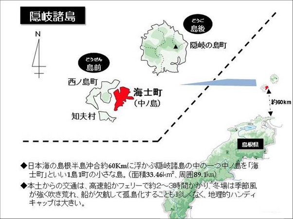 海士町は島根県の北60 キロ、日本海に浮かぶ隠岐諸島の中の一つ、後鳥羽上皇が流された島であり、神楽や民謡、俳句などの歴史文化や伝統が残る一方、島すべてが国立公園に指定されるほどの自然豊かな半農半漁の地です。