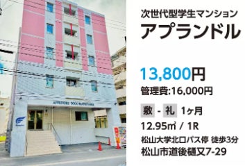 愛媛大学周辺の学生向け賃貸物件を中心に、敷金礼金なしや家具付き・初期費用が安い物件など、お得で安心して暮らせる部屋探しをサポートします。