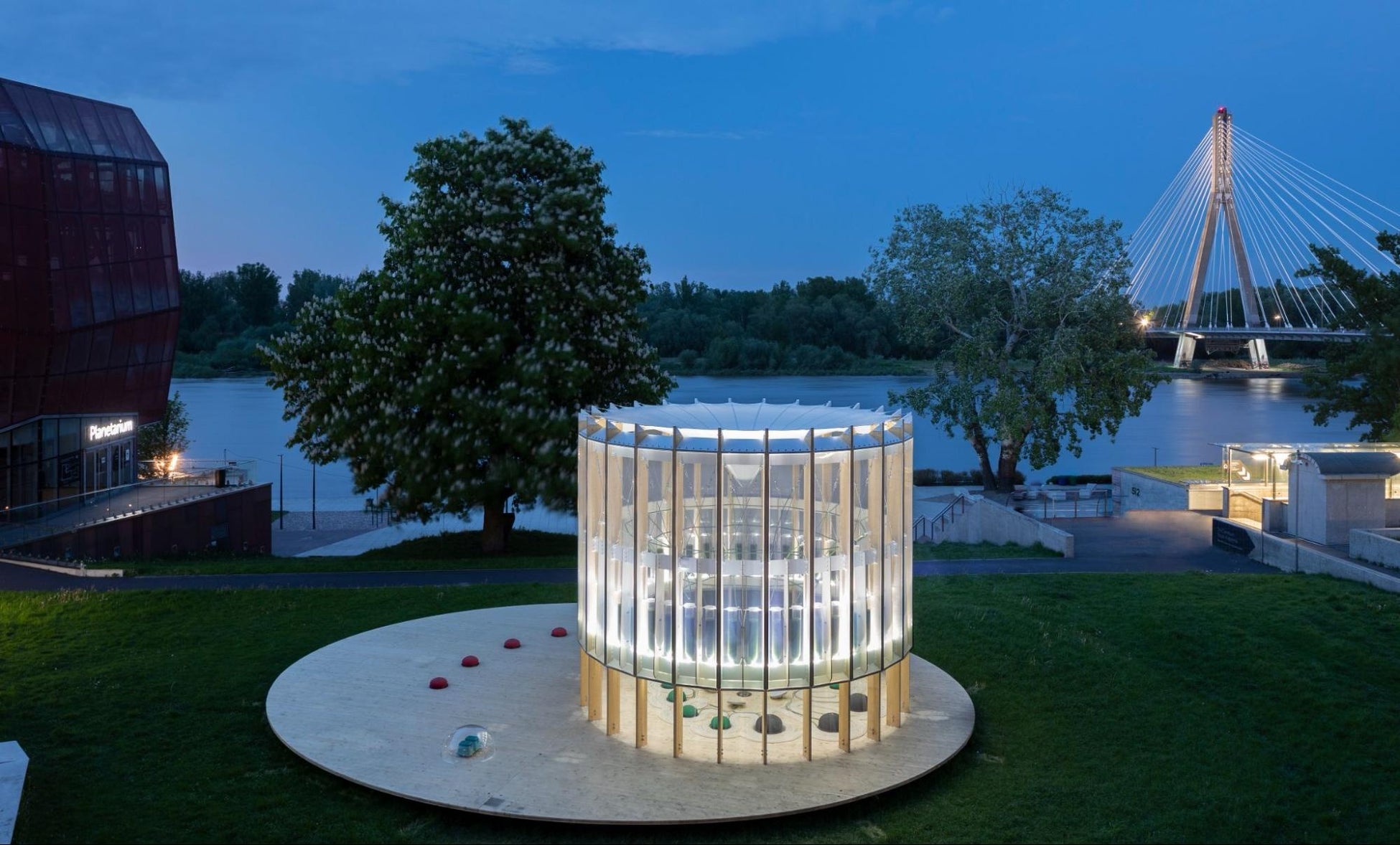 AIRBUBBLEは、ポーランドのワルシャワの中心部に、子どもたちが遊ぶための浄化された微気候、つまり清浄な空気の泡を作り出します。52個のガラス製藻類リアクターを保護するETFE膜に包まれた円筒形の木造構造の都市型藻類温室です。このスペースには、ロープ、フットポンプ、弾力のある球が設置されていて、遊び場としても屋外教室としても機能します。藻類培養システムの白い泡の音は、周囲の都市騒音を隠し、遊びと交流の場として落ち着いた雰囲気を作り出しています。
