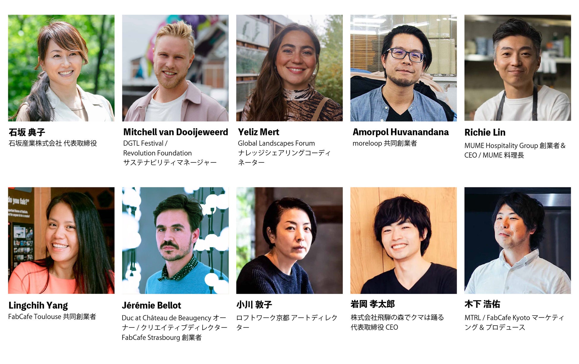 | ・岩岡 孝太郎 (株式会社飛騨の森でクマは踊る 代表取締役 CEO) ・Lingchih Yang (FabCafe Toulouse 共同創業者) ・Jérémie Bellot (Duc at Château de Beaugency オーナー & クリエイティブディレクター / FabCafe Strasbourg 創業者) ・小川 敦子 (ロフトワーク京都 アートディレクター) ・木下 浩佑 (MTRL / FabCafe Kyoto マーケティング & プロデュース) |