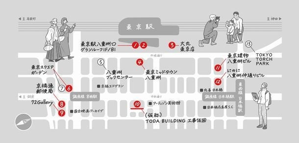 東京駅八重洲口グランルーフ1F、東京駅八重洲口グランルーフB1、大丸東京店、東京ミッドタウン八重洲、八重洲ブックセンター、東京スクエアガーデン、京橋通郵便局、72Gallery、(仮称)TODA BUILDING工事仮囲、東京建物八重洲ビル、にのに八重洲仲通りビル、TOKYO TORCH Park