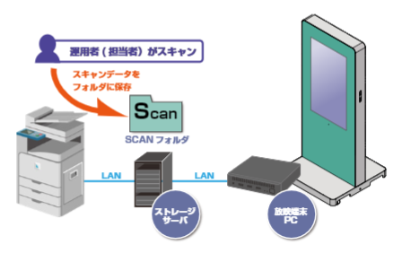 FAX複合機と連携させることで、スキャニングされた紙の資料を、すぐにサイネージ放映に反映できます。デジタル化されていない情報(コンテンツ)を、ダイレクトにサイネージに掲出できます。