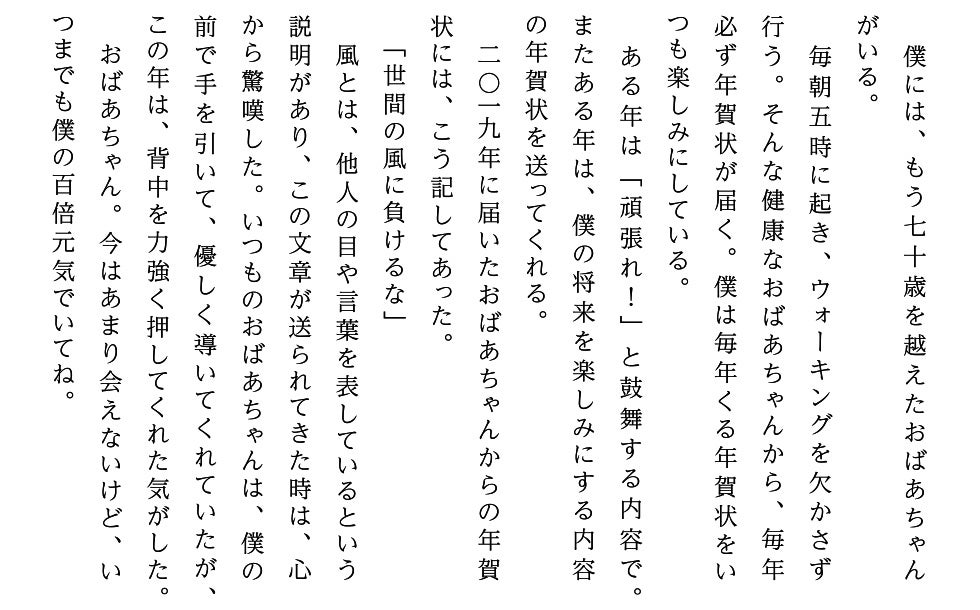 毎年届く祖母からの年賀状。中学生の筆者へ送った祖母のメッセージは、これまでの優しく導くものではなく、力強く背中を押してくれるものに変化していた・・・。筆者の感受性と逞しく成長していく様子が感じられるこのエピソードが第14回の大賞に選ばれました。本作品はショートムービーとして映像化しており、全受賞作品と一緒に第14回の受賞作品発表ページで見ることができます。