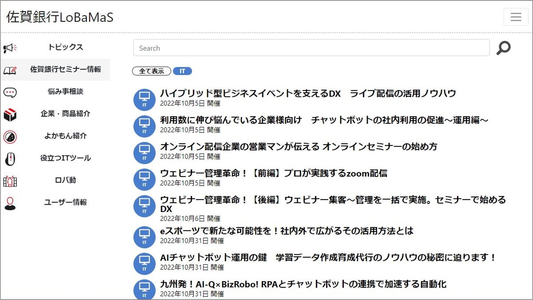 「佐賀銀行LoBaMaS」は、木村情報技術が開発した、地方創生を実現する企業支援プラットフォームです。入会費無料で、申込みいただいた法人会員企業が、インターネット上のWebサイトにログインし利用するサービスです。経営に役立つ情報を無料でお届けするほか、法人会員からのセミナー申込みや相談等も可能です。