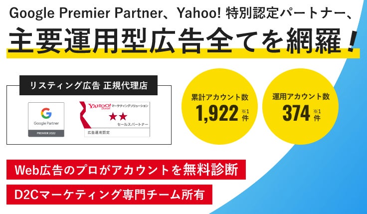 累計アカウント数1,922件、運用アカウント数374件の豊富なWeb広告運用実績と、GoogleやYahoo!に認められた確かな広告運用力があります。Googleが主催する「Premier Partner Awards」では、4期連続の国内ファイナリストに選出されており(※1)、Yahoo!のパートナー制度では、2つ星の代理店として認定を受けると同時に、国内で35社のみの広告運用認定パートナーとしても認定を受けています(※2)。