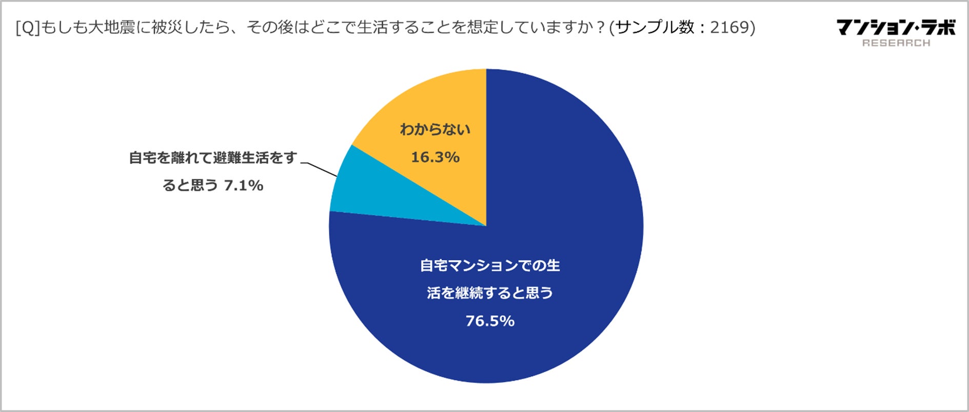 A. 自宅マンションで生活すると思う 76.5% / 自宅を離れて生活すると思う 7.1% / わからない 16.3%