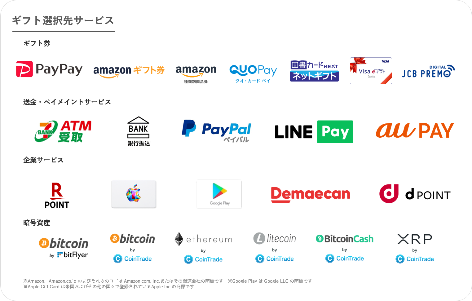 アンケート回答、資料請求、お見積もりの謝礼、社内イベントのインセンティブ、etc.