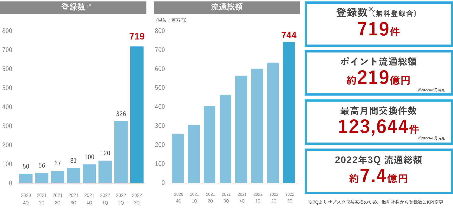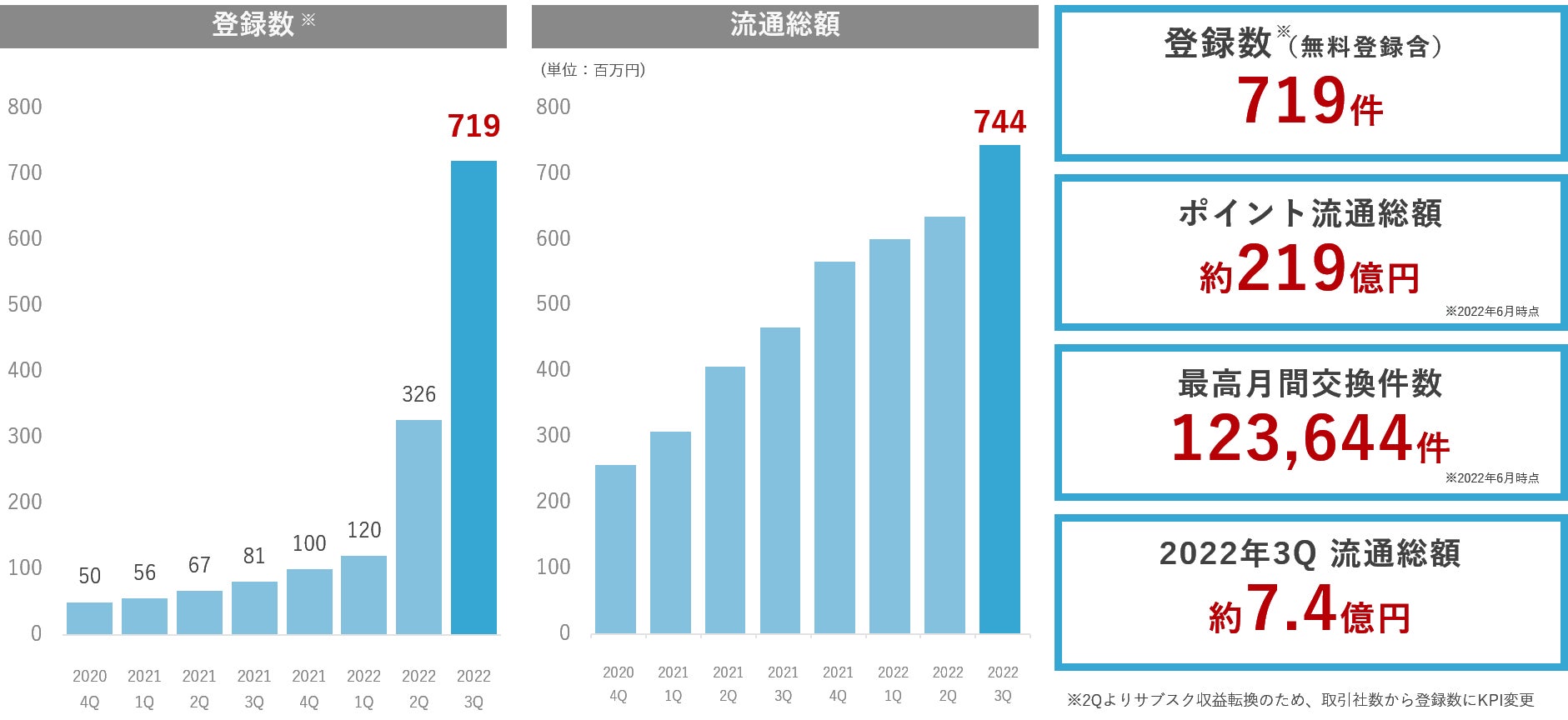 2022年度通期目標である登録数1,000件に向け、展示会への出展などサービス認知度向上を目的に営業活動を引き続き強化、来場者キャンペーンなどの施策が実を結び、トランザクション数、登録数、流通総額が大幅に増加、多くの企業様にご利用いただける結果となりました。