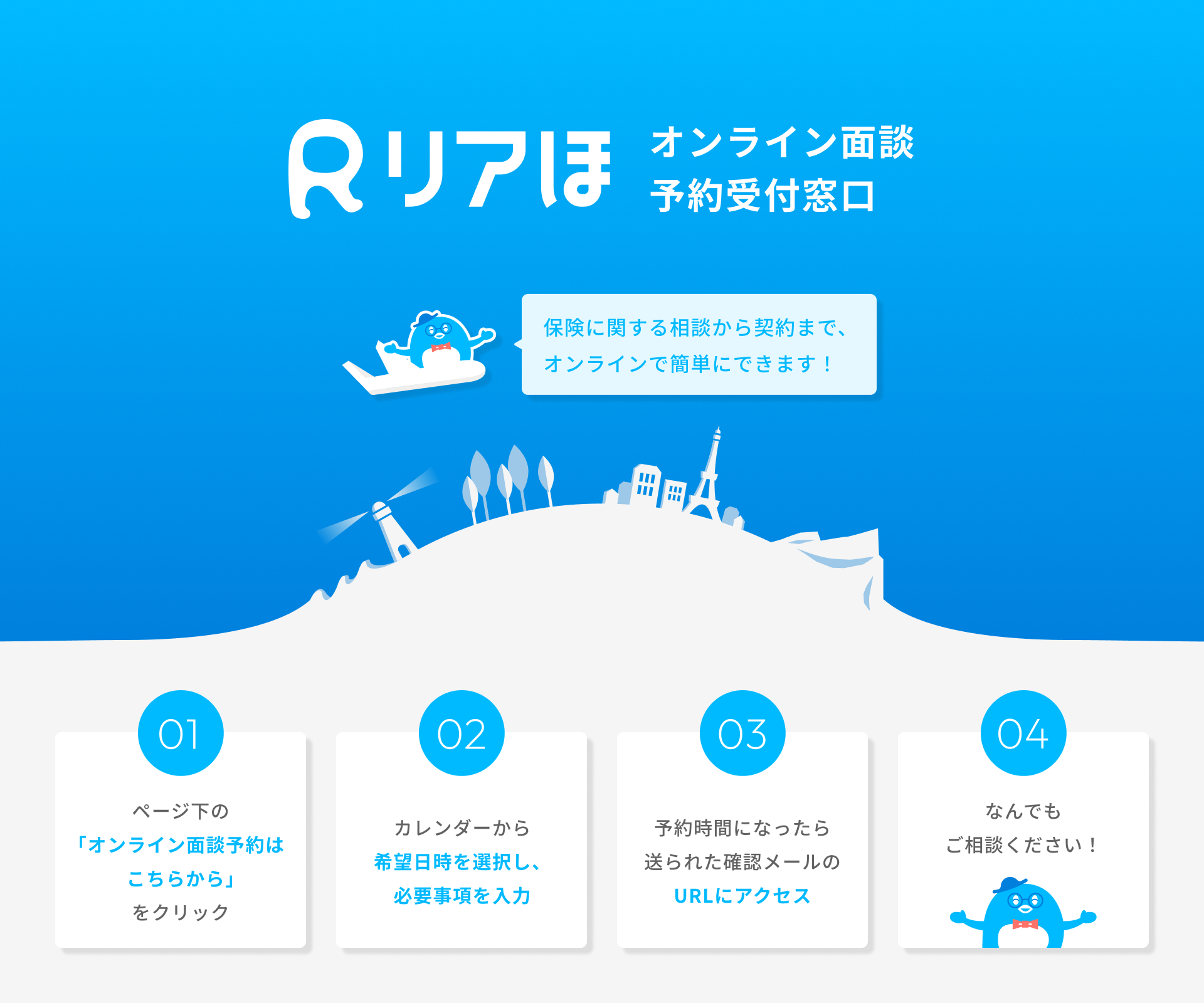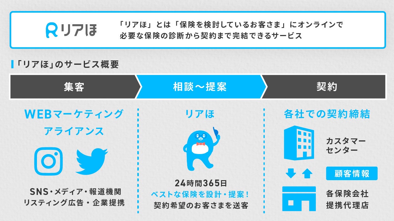 「リアほ」は、保険を検討しているお客さまにオンラインで必要な保険の診断から契約まで完結できるサービスです。これまでの保険相談でお客さまが抱えていた「相談や手続きに長時間かかる」、「店舗でしか相談できない」などの悩みを、「Thumva BIZ」のID等が交換不要の「即時相談機能」や、順番待ちが解消できる「予約機能」の導入により解消することができます。