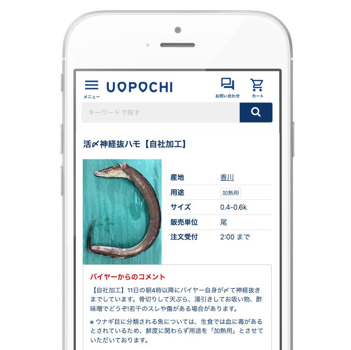 魚活ボックスで仕入れたハモの商品詳細画面(飲食店向け仕入れサイト「魚ポチ」より)
