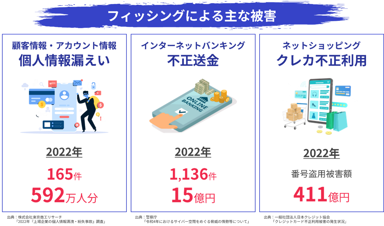 フィッシング詐欺は、インターネット上で個人情報を不正に入手する手口の一つであり、その被害は深刻化しています。2022年の日本国内におけるフィッシング報告件数は96万件超(※1)と2017年からの5年間で約100倍に急増しており、フィッシング詐欺による被害は、個人情報の漏洩、インターネットバンキングでの不正送金、クレジットカードの不正利用など、多岐にわたって発生しています。