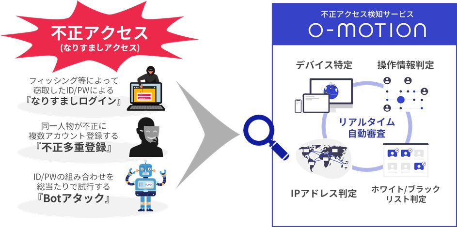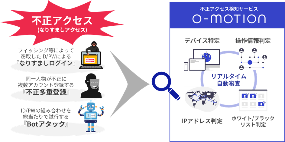 金融サービスサイト(インターネットバンキング・ネット証券)、通販サイト等において導入されている不正アクセス検知サービス「O-MOTION(オーモーション)」により、フィッシングで詐取された情報を悪用した「なりすましログイン」を検知。フィッシング詐欺の被害を水際で防止し、実効性の高い対策が可能です。